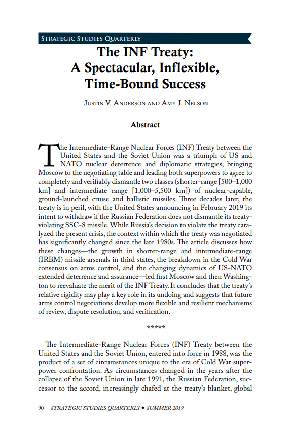 The Intermediate-Range Nuclear Forces (INF) Treaty between the United States and the Soviet Union was a triumph of US and NATO nuclear deterrence and diplomatic strategies, bringing Moscow to the negotiating table and leading both superpowers to agree to completely and verifiably dismantle two classes of nuclear-capable, ground-launched cruise missile and ballistic missiles. While Russia's decision to violate the treaty catalyzed the present crisis, the context within which the treaty was negotiated has significantly changed since the late 1980s. This article discusses how these changes--the growth in shorter-range and intermediate-range (IRBM) missile arsenals in third states, the breakdown in the Cold War consensus on arms control, and the changing dynamics of US-NATO extended deterrence and assurance--led first Moscow and then Washington to reevaluate the merit of the INF Treaty. It concludes that the treaty's relative rigidity may play a key role in its undoing and suggests that future arms control negotiations develop more flexible and resilient mechanisms of review, dispute resolution, and verification. READ MORE>>>